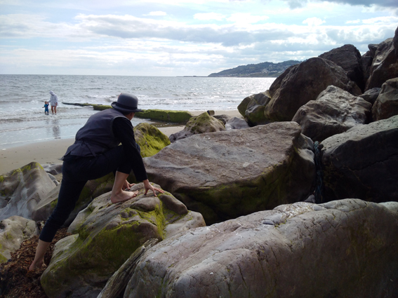 A figure in a bowler hat, waistcoat and rolled-up trousers brushes sand from their feet. They read a book in front of a painted beach hut, climb on rocks, clutch a newspaper, wait, fall asleep and look out to sea. In one moment after another, we see tourism performed and time laid out in photographic frames like film stills.